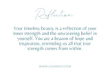 "Your timeless beauty is a reflection of your inner strength and the unwavering belief in yourself. You are a beacon of hope and inspiration, reminding us all that true strength comes from within."